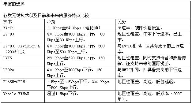 以前,當(dāng)某位員工要出差時(shí),公司只要給他一部蜂窩手機(jī)和一臺(tái)用于撥號(hào)接入數(shù)據(jù)網(wǎng)絡(luò)的筆記本電腦即可。但是,這種日子已經(jīng)一去不復(fù)返了。今天的無(wú)線市場(chǎng)中充滿了各種新興的選擇,并且無(wú)論從功能還是特性方面都有很大的提升。雖然所有這些主要技術(shù)都支持無(wú)線通信,但用戶需要考慮并做出決定的東西也更多,如設(shè)備、運(yùn)營(yíng)商、性能和覆蓋范圍等。